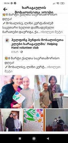 8 მარტი ქალთა მსოფლიო დღეა. ამ დღის პატივსაცემად დავარიგე საკუთარი ხელით დამზადებული მისალოცი ბარათები მასწავლებლებთან, მშობლებთან, მოზარდ გოგონებთან... მათგან უდიდესი სითბო და სიყვარული დავიმახურე. ვარ ბედნიერი, რომ შევძელი გარკვეულ ადამიანთა რიცხვის გაბედნიერება ჩემი ამ აქტივობით.