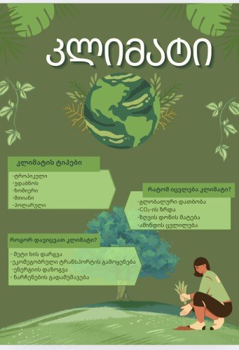 პროექტის ფარგლებში ''მოხალისეობა დადებიტი ცლილებებისთვის''მე გავაკეთე პროექტი კლიმატზე და თუ რამდენად მნიშვნელოვანია ის ჩვენ ცხოვრებაშო რისთვისაც დამჭირდა 1 საათი