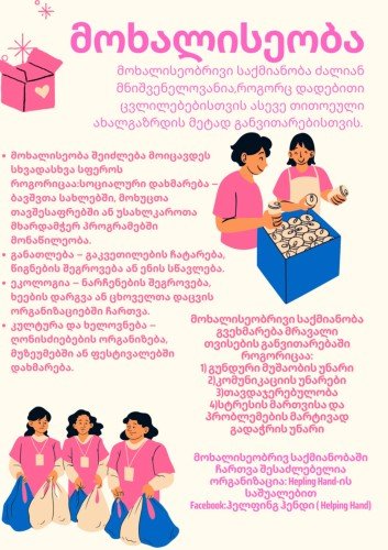 პროექტის აღწერამარტი-აპრილის თვეების განმავლობაში მენტორობას ვუწევდი რამდენიმე ახალბედა მოხალისისგან დაკომპლექტებულ ჯგუფს, ეს "ჰელჰინგ ჰენდის" ერთ-ერთი ინიციატივის ფარგლებში "მოხალისეთა პროგრამა თბილისის ახალგაზრდებისთვის" განვახორციელე.