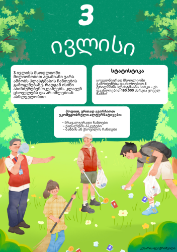 პროექტის აღწერა3 ივლისს მსოფლიო უარს ამბობს პლასტმასის ჩანთების გამოყენებაზე.შევქმენი პოსტერი,რომელიც მიზნად ისახავს საზოგადოების ცნობიერების ამაღლებას პლასტმასის ზიანსა და ეკომეგობრულ ალტერნატივებზე.