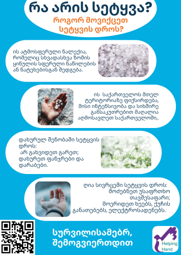 პროექტის ფარგლებში და მენტორის ორგანიზებით შემქმენით რამდენიმე პოსტერი და გავუზიარებთ სხვებს, მათ შორის მე მოვიძიე ინფორმაცია და შევქმენი პოსტერი სეტყვაზე და იმაზე თუ როგორ უნდა მოვიქცეთ სეტყვის დროს. 1სთ