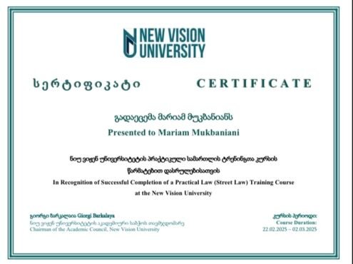 შენახვა სამართლებრივი დახმარება ნიუ ვიჟენ უნიბერსიტეტის “პრაქტიკული სამართლისა და უნარ-ჩვევების კურსი” mariam.mukbaniani9 26715