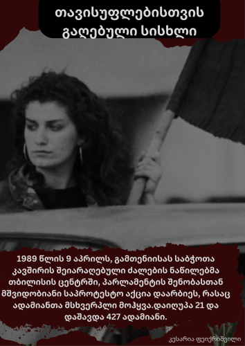 პროექტის აღწერა1989 წლის 9 აპრილი საქართველოს ისტორიაში უმნიშვნელოვანესი დღეა,ამიტომ შევქმენი პოსტერი და გავავრცელე სოციალურ ქსელებში და მოხალისეების ონლაინ ჯგუფებში.