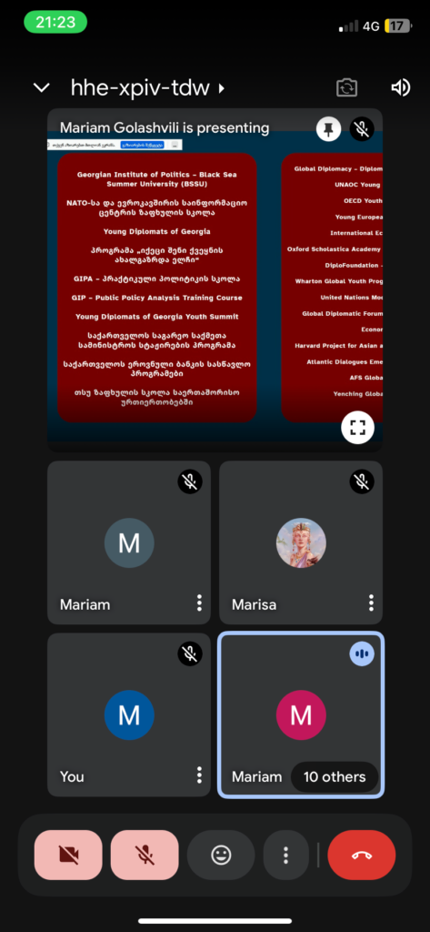 მე ვმონაწილეობდი „Helping Hand“ პროექტში, რომელიც ეხებოდა საერთაშორისო ურთიერთობებს, დიპლომატიასა და ეკონომიკას. პროექტის ფარგლებში მე დავესწარი ონლაინ შეხვედრებს სხვადასხვა უნივერსიტეტებთან, სადაც გაეცნო ამ მიმართულებებში ჩაბარების შესაძლებლობებს, სტიპენდიებს, გაცვლით პროგრამებსა და სტუდენტურ აქტივობებს. ასევე გავიგე, რა პრაქტიკული გამოცდილებები და შესაძლებლობები შეუძლია მომავალში გამოიყენოს კარიერული განვითარებისა